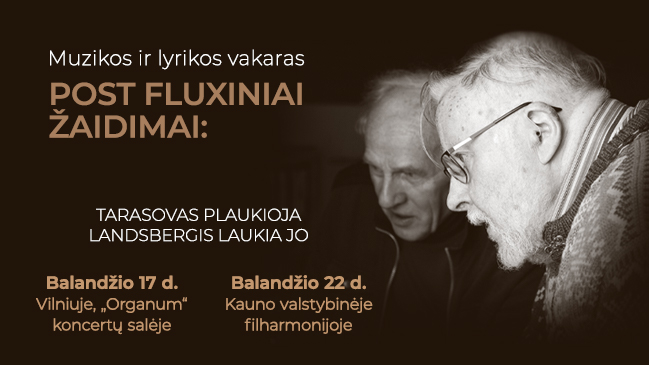 Po avangardiniu pavadinimu „Post Fluxiniai žaidimai: Tarasovas plaukioja, Landsbergis laukia jo“ slypi ypatingas projektas – muzikos ir lyrikos vakaras, kurio metu prof. Vytautas Landsbergis skaito savo poeziją, o Vladimiras Tarasovas ją užpildo užburiančiais perkusijos garsais. Šis unikalus dviejų scenos meistrų dialogas vyks balandžio 17 d. Vilniuje, „Organum“ koncertų salėje ir balandžio 22 d. Kauno valstybinėje filharmonijoje.